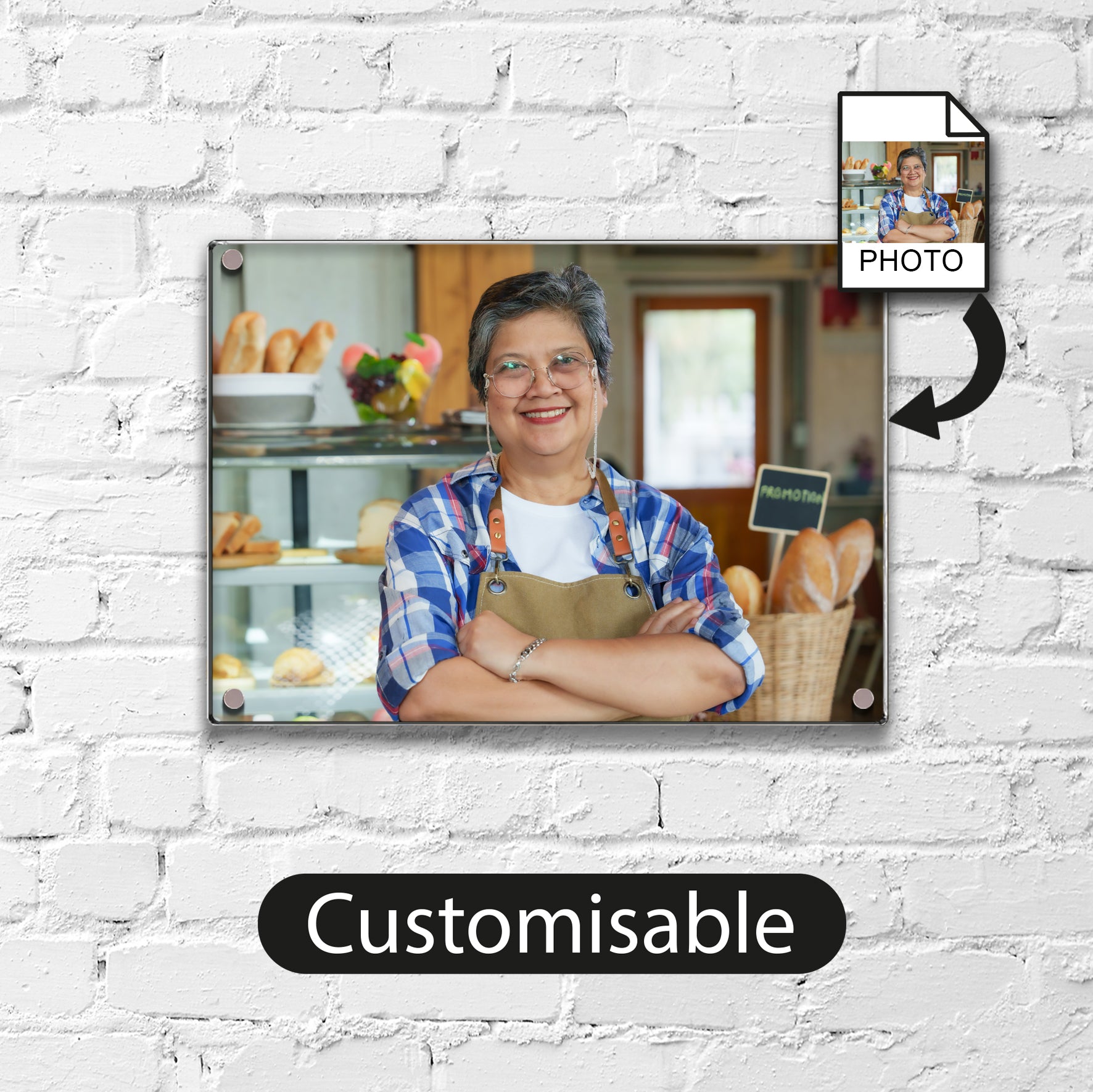 Perfectly priced to be affordable for all sizes of business. Use this acrylic sign to display photos or your own art from files in formats '.JPG', '.PNG', and '.HEIC' as well as other file formats such as '.AI', 'PDF', and '.EPS'.